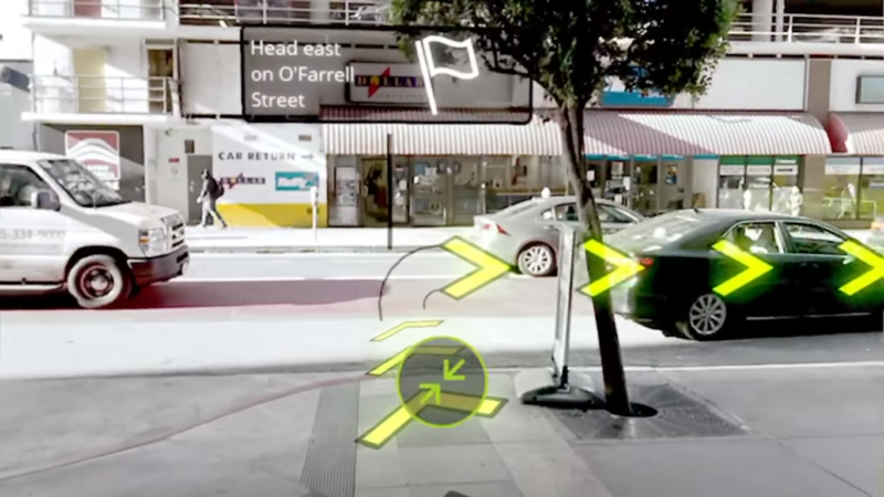 A recently published World Exploration demo shows how all of these technologies come together: A person using a mobile phone searches for a location nearby (Union Square Park in San Francisco). The app continues to project the route in 3D hologram-style and shows the walking on the display, using augmented reality technology and the mobile phone’s camera. Instead of consulting a map, you get to see the route presented on top of a physical 3D world view rather than a 2D mapped representation. What´s different is that you need to hold the phone upwards and keep doing so as you walk, as the camera functions as a separate “eye” to create the 3D view to project the AR routing information on. The visual results are quite impressive.