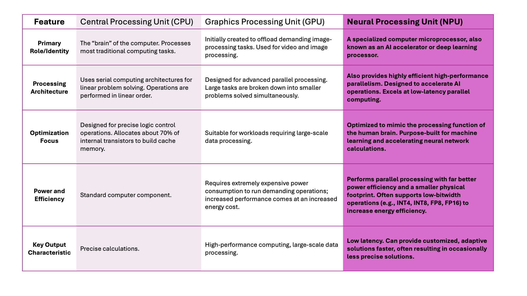 NPUs excel at low-latency parallel computing, breaking down large problems into smaller components that can be processed simultaneously. This makes them well-suited for interpreting fast-changing sensor or imagery inputs in real time, which is a capability increasingly vital for autonomous systems and field-based geospatial tools.