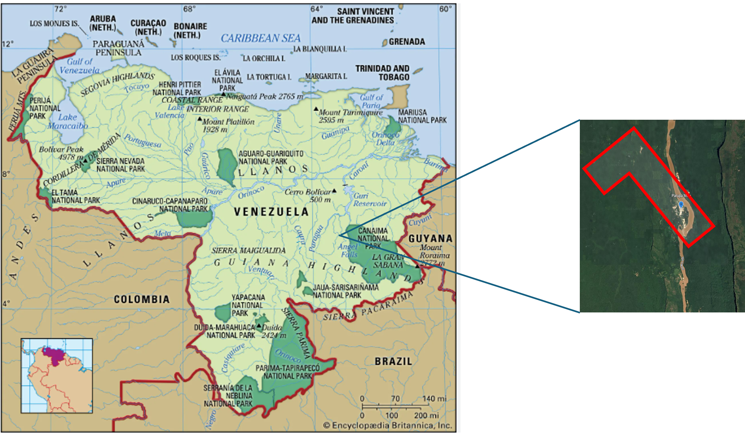 The particular plot of land to be measured was located at the very edge of the mining section of the Venezuelan Amazon region (N 5o 45’ 08” / W 62o 54’ 12”). It was only accessible by dugout canoe on the Caroni River, after a dangerous flight on a single engine plane from the city of Ciudad Bolivar. The shape of the concession was an inverted L, following the contours of the Parupa River and covering the most promising mining areas.