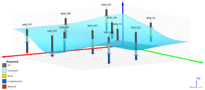 Colorized 3D Drillhole Intervals Based on Keywords – Users can now use text keywords, such as “Limestone” or “Granite” to colorize the intervals in their 3D drillholes, making it easier to visualize stratigraphy, mineralization content, or formations. Surfer automatically generates a legend showing the colors and keywords, greatly speeding the model-making process.